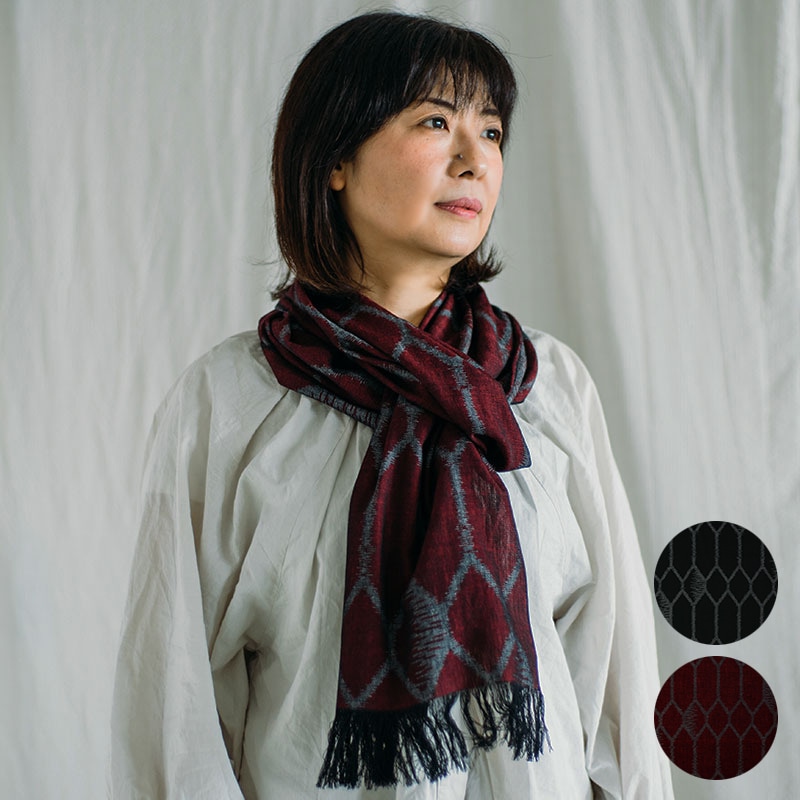 - 長い伝統の中で試行錯誤を積み重ね、熟成された技術を軸(経糸)に、下川織物の旬なデザイン(緯糸)を織り込んで仕上げた「旬を織りなす」久留米絣ストール。