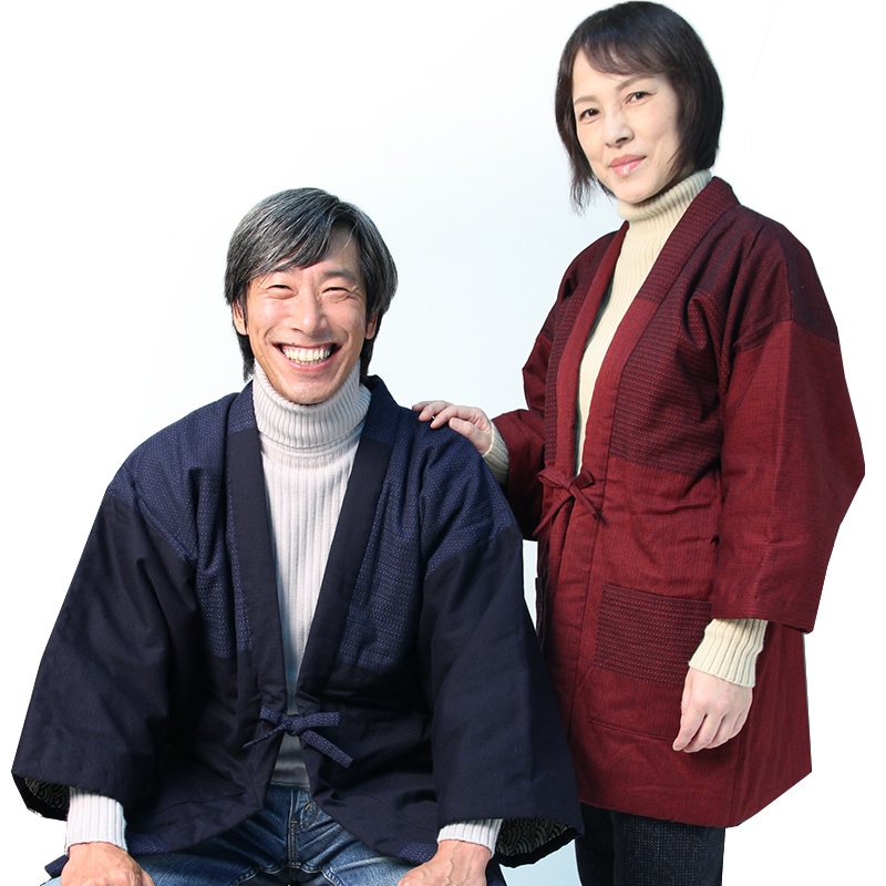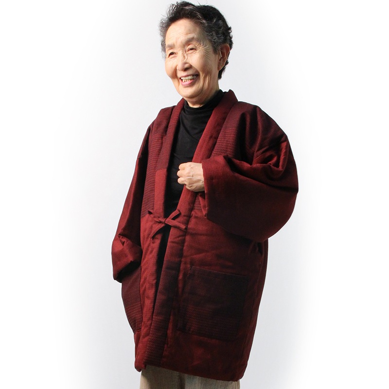 半纏の丈に合わせ3つの柄を織り上げた和木綿「折鶴」を使用。表地の上品な色彩と裏地の吉祥文様仕立てで、贈りものギフトに人気。日本製。