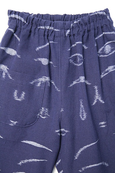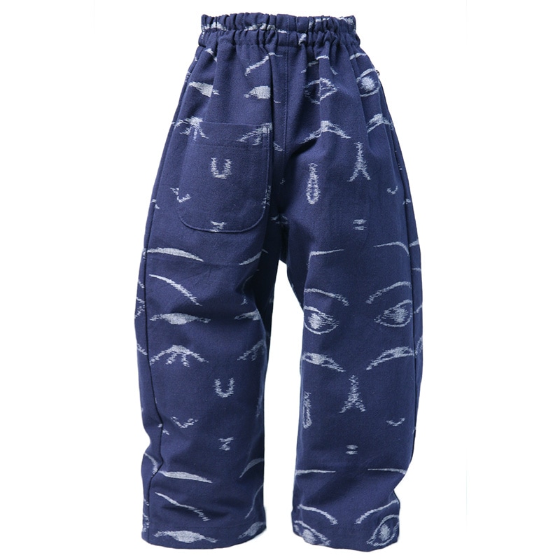 COMPANY×宮田織物×下川織物×うなぎの寝床の豪華限定コラボ商品。こけしを元にデザインされた久留米絣が個性的なキッズ用MONPEパンツ。日本製。