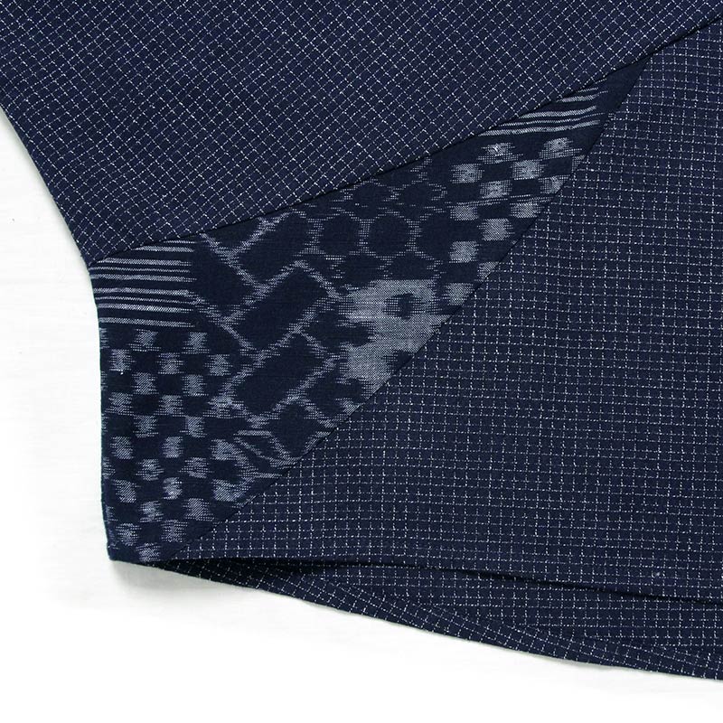 彩藍の中でも特に人気のバタフライ型ブラウスのデザインを一新!和木綿「文人調・蚊絣調」を使用し、特徴的な織り柄の久留米絣と組み合わせています。日本製