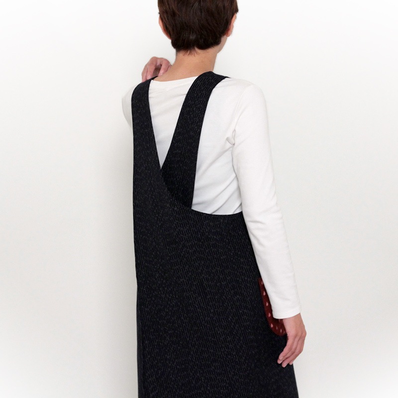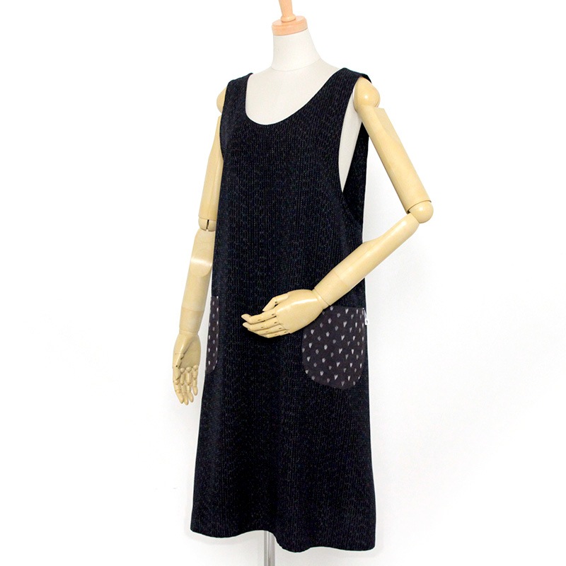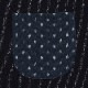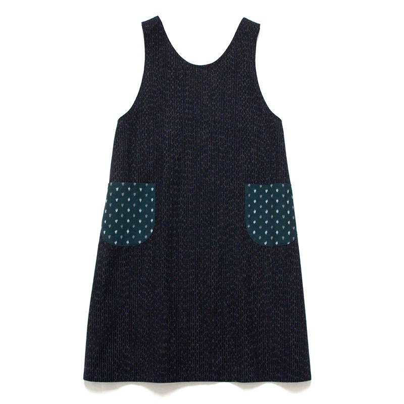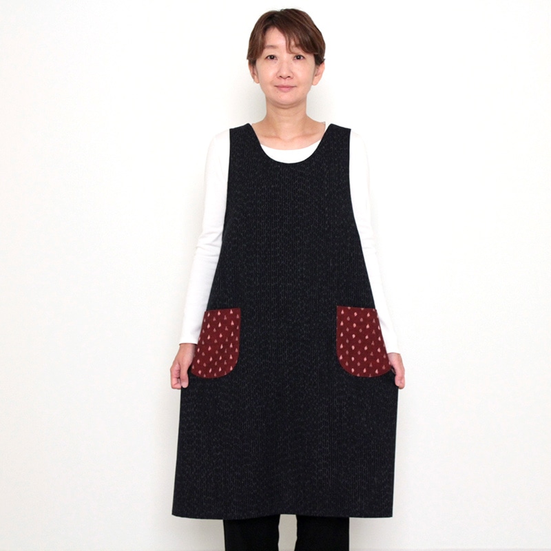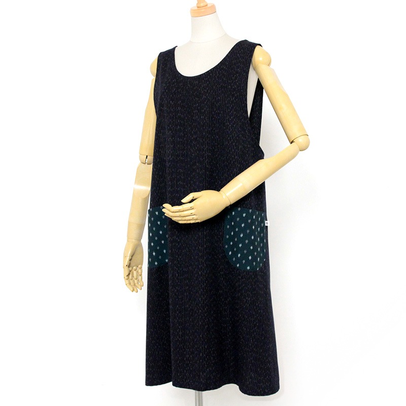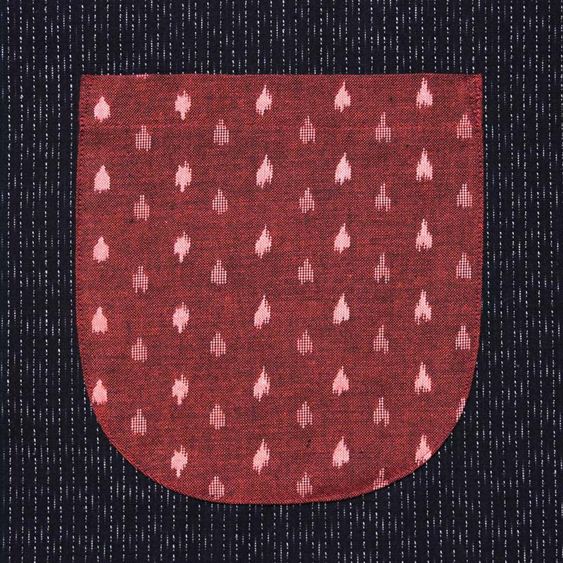 濃紺地に繊細な白の柄が美しい和木綿「蚊絣調」を使用したキッチンエプロン。ポケット部分の久留米絣の水玉絣は4色展開です。