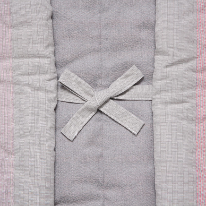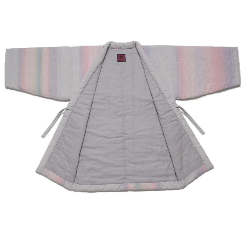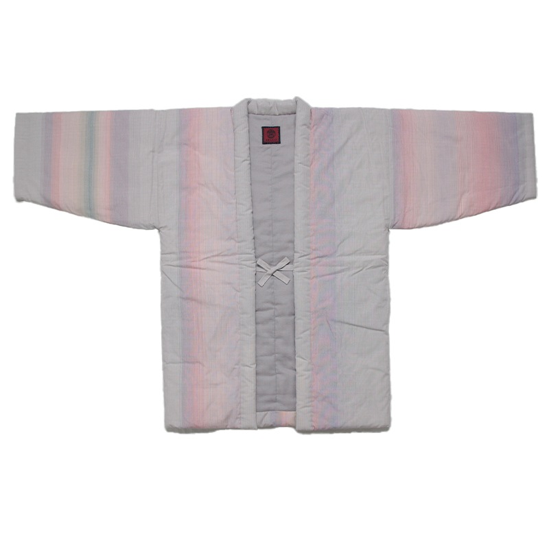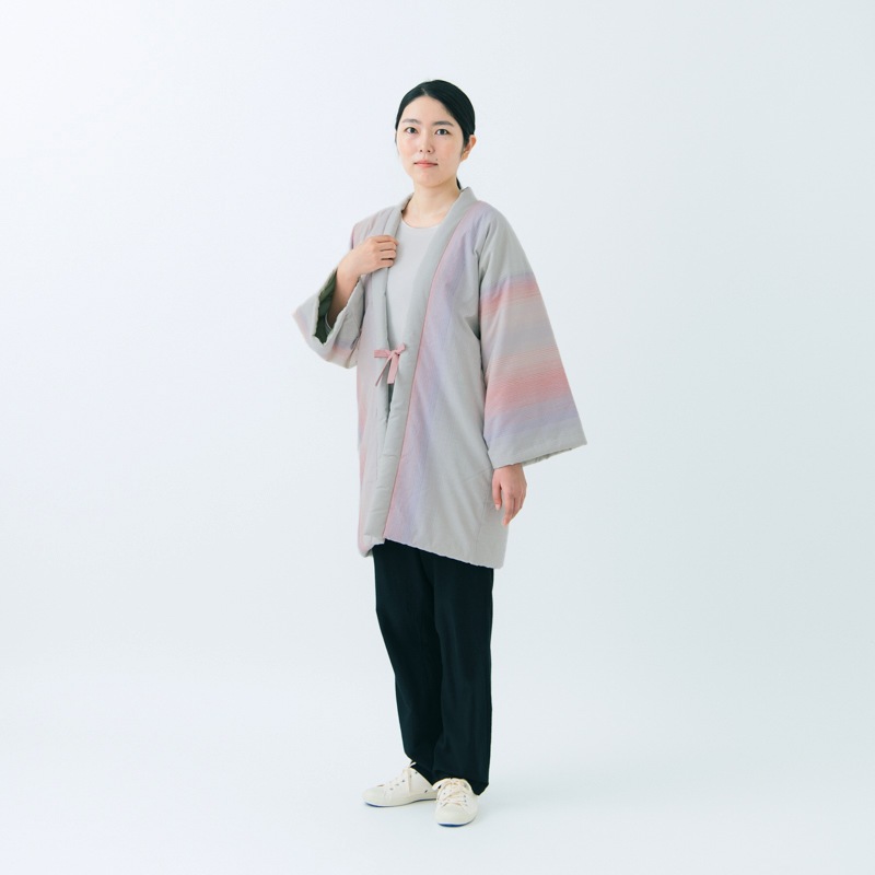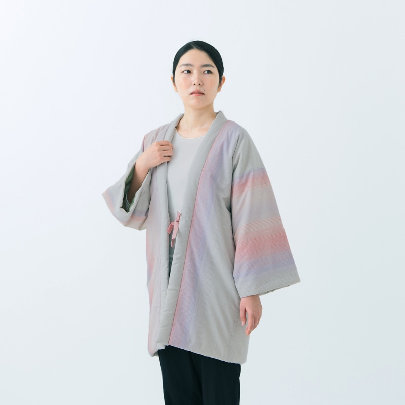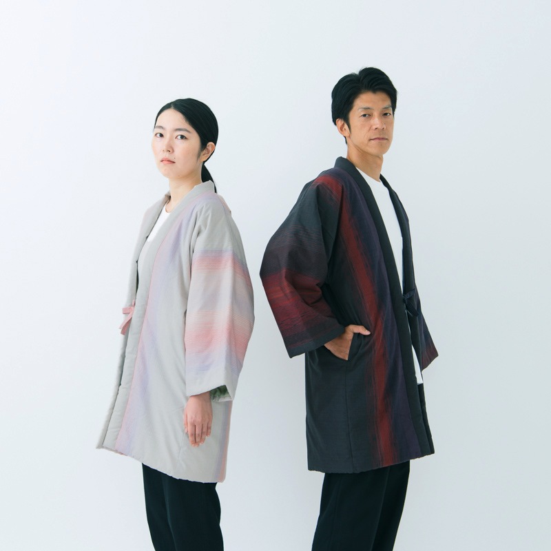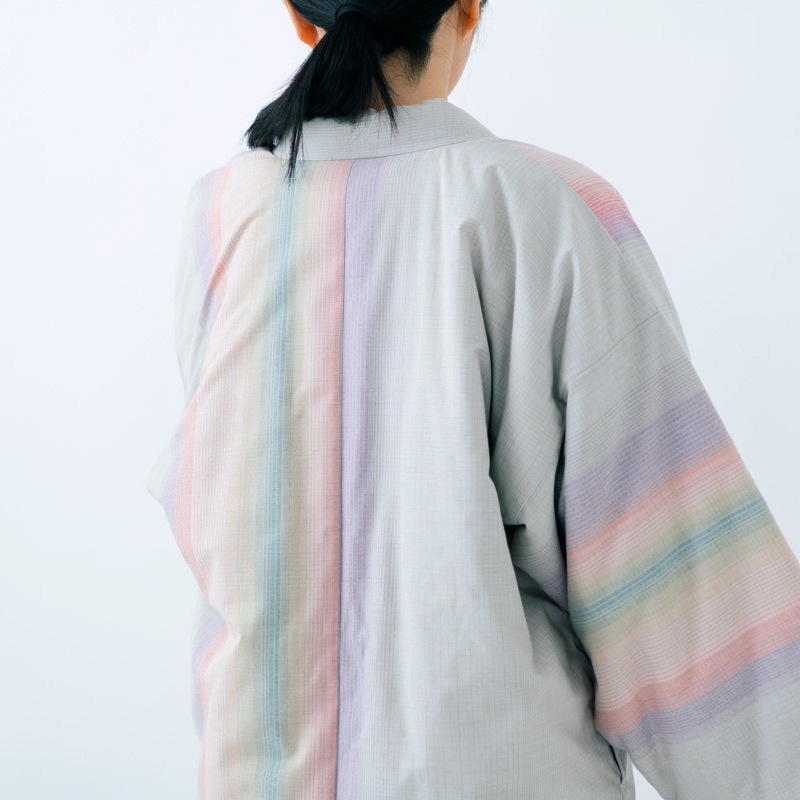 2024年粋シリーズ新作袢天は「源氏物語」をテーマに制作。平安時代、成人した女性は御簾を隔ててしか会話することができず、普段の生活で 男女がお互いに顔を見ることができない状態でした。御簾から見える十二単衣の重ねた色を表現しました。日本製。