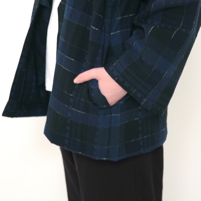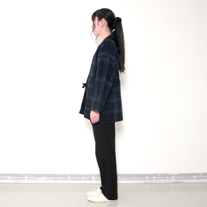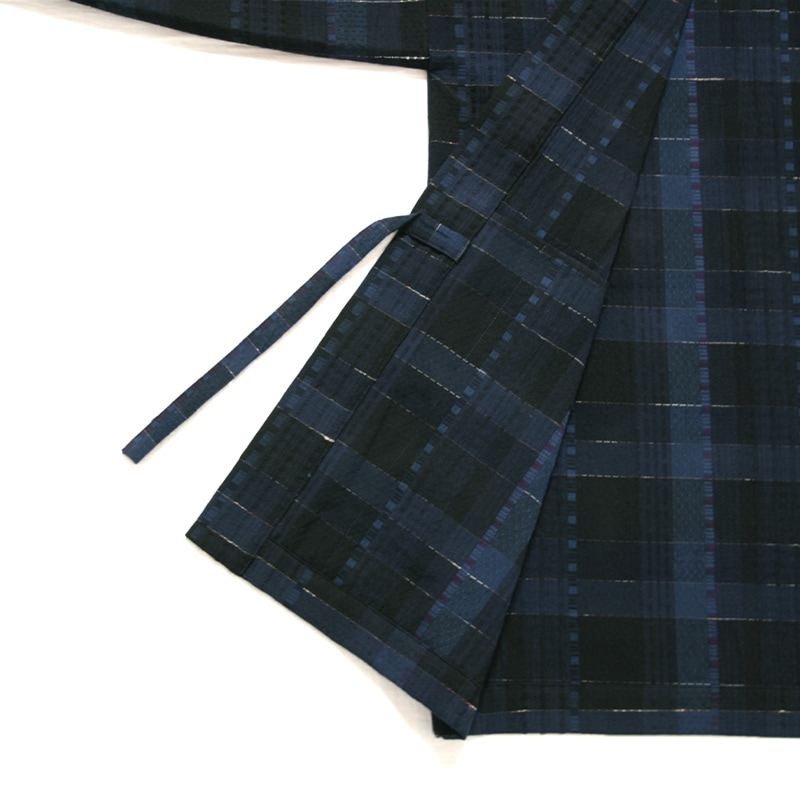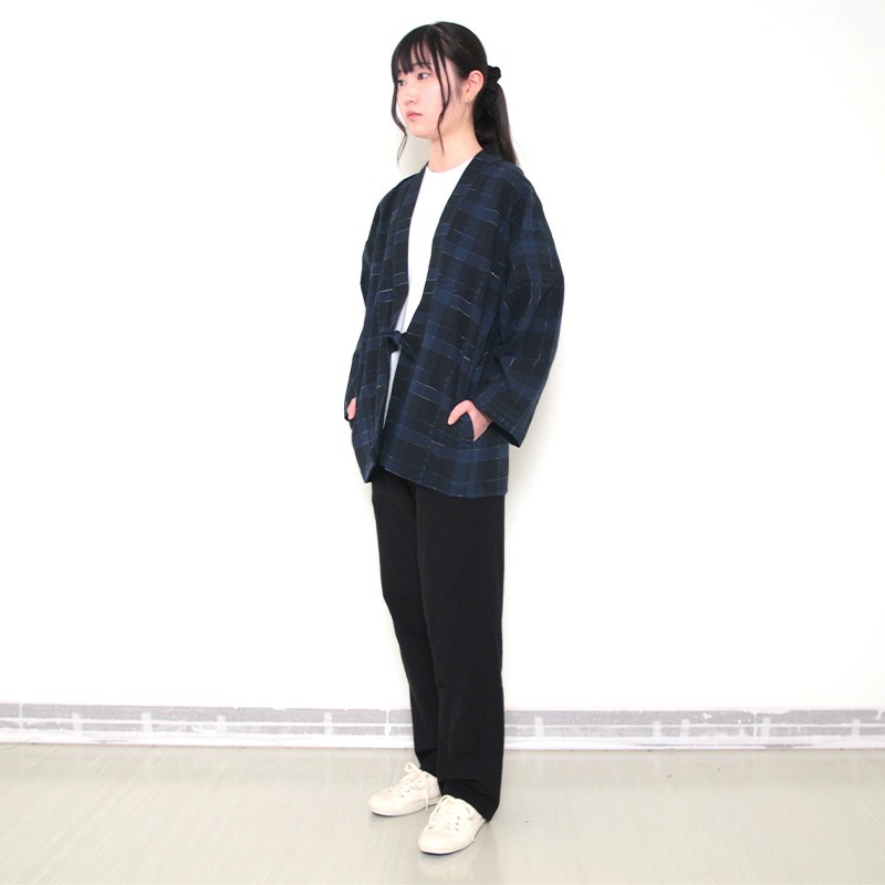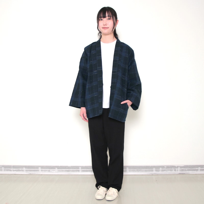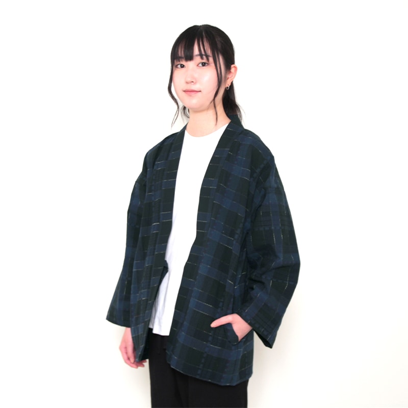 落ち着いた格子柄と趣のある表情が魅力のhaori。和木綿「oonisiki」で仕立てた、奥行きのある一枚です。日本製。