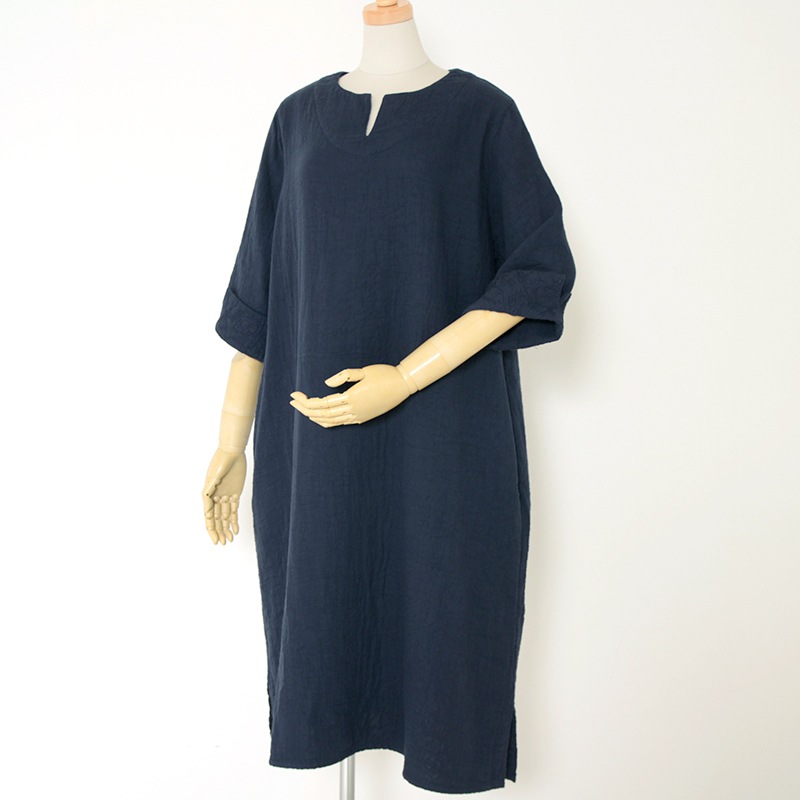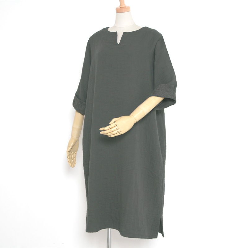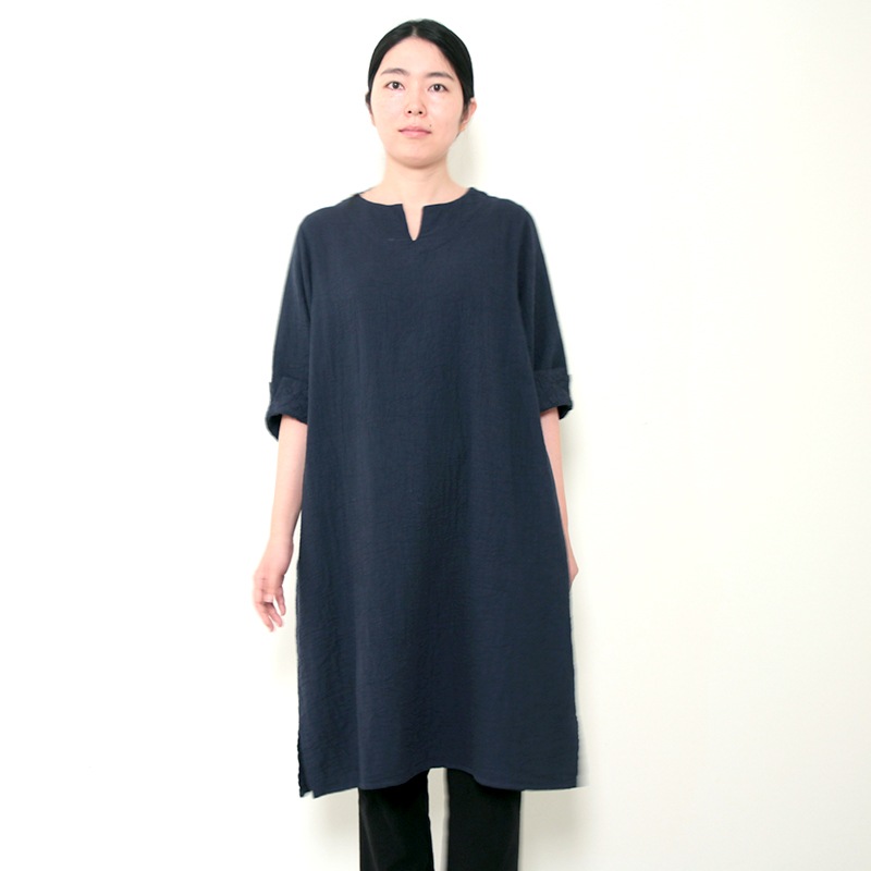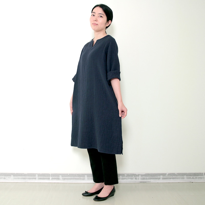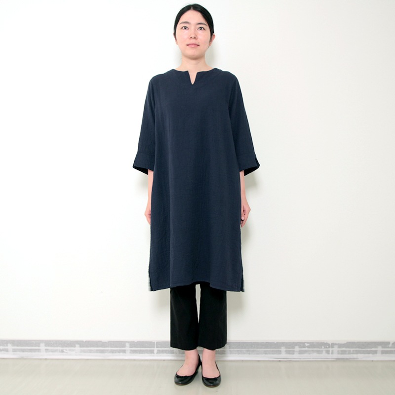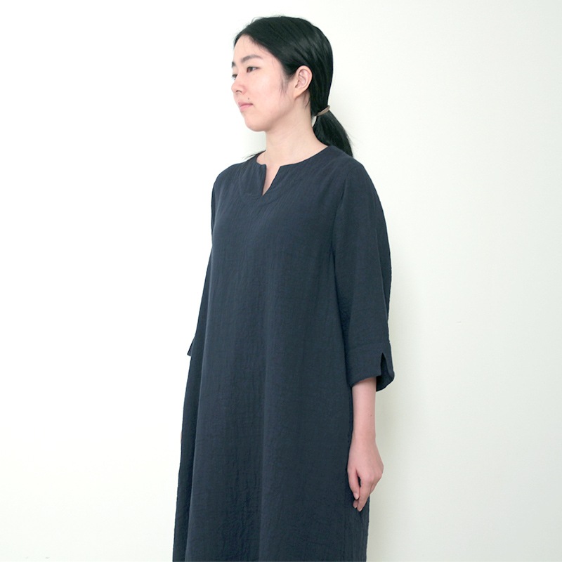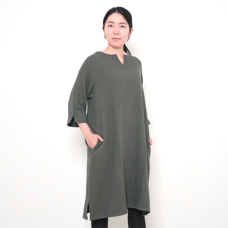 天然素材を中心に上質のモノづくりを行なう五感がつくる三重織ガーゼのワンピース。ガーゼの優しい肌ざわり。新色のグレーが仲間入りしました。日本製