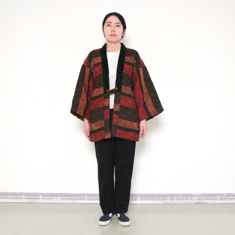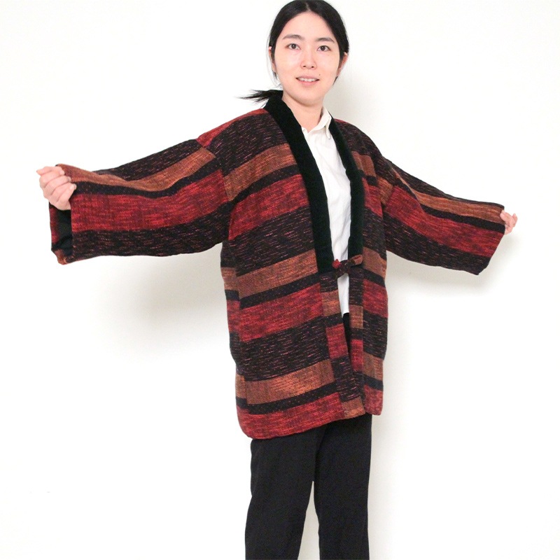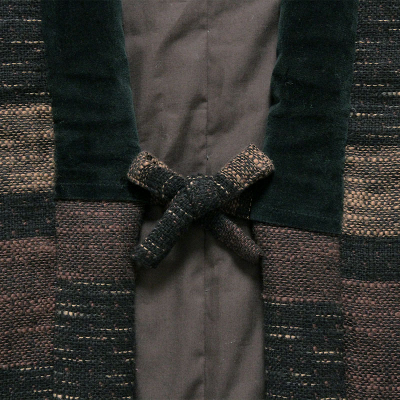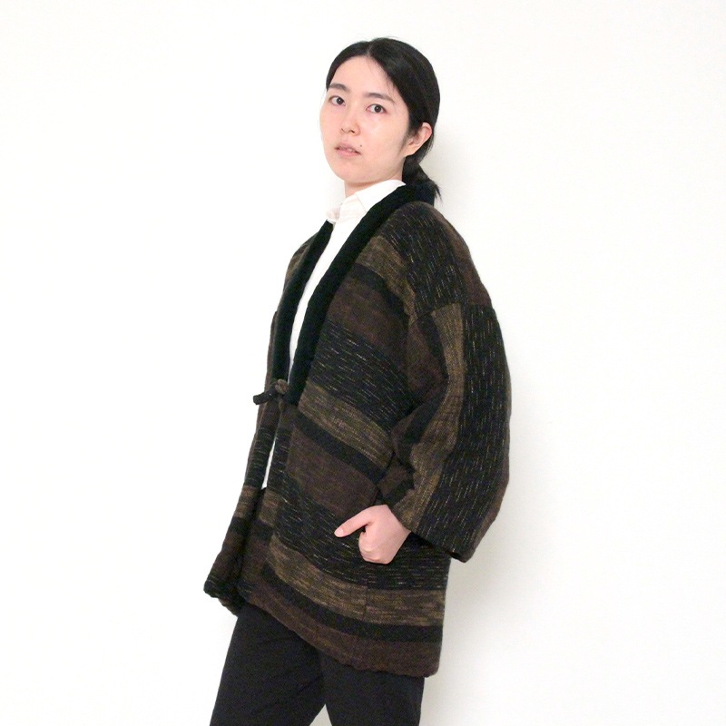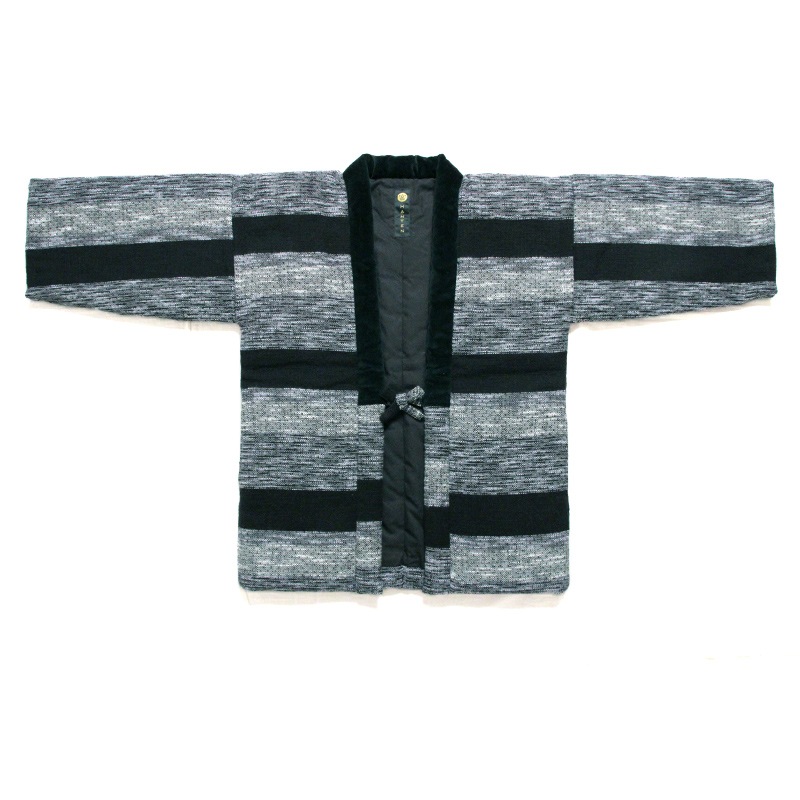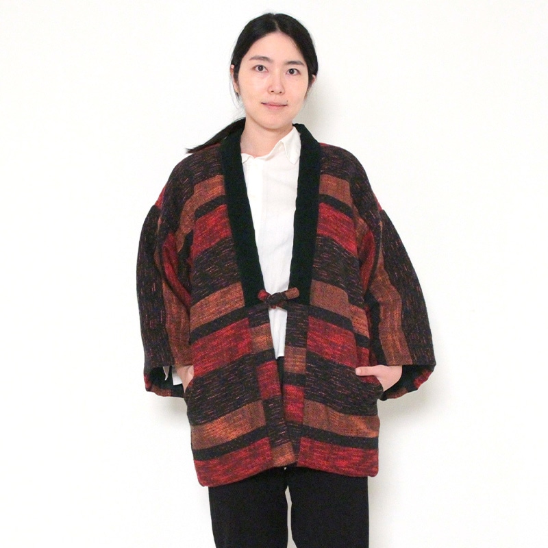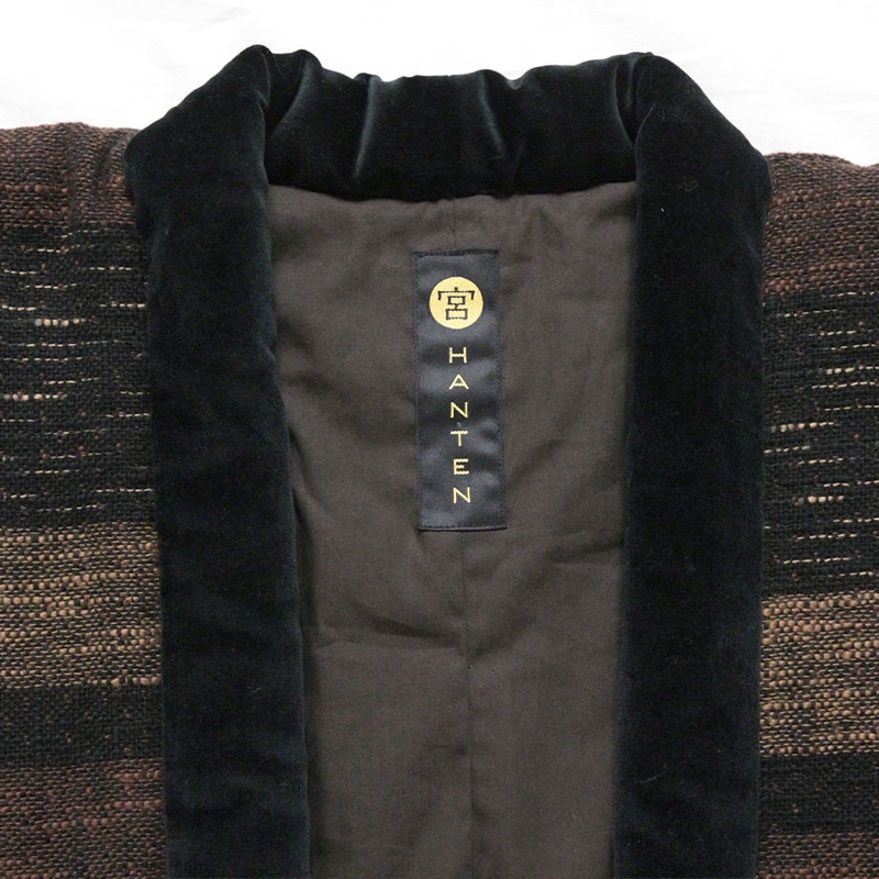 風通織りの立体感と色の重なりが生み出す、表情豊かなはんてんができました。風通織りならではの奥行きを丁寧に引き出し、上品な雰囲気をまとったデザインに仕立てています。黒別珍衿仕立て。日本製。
