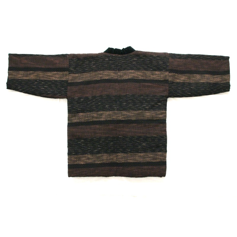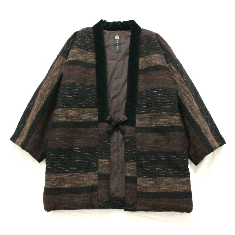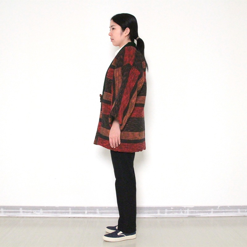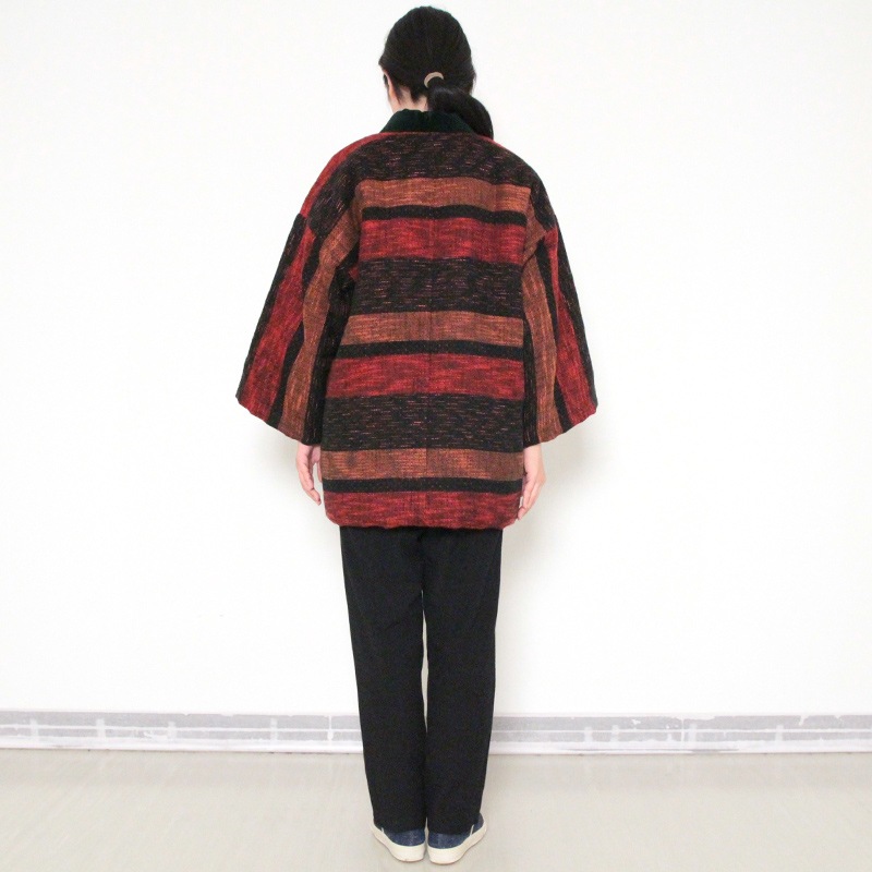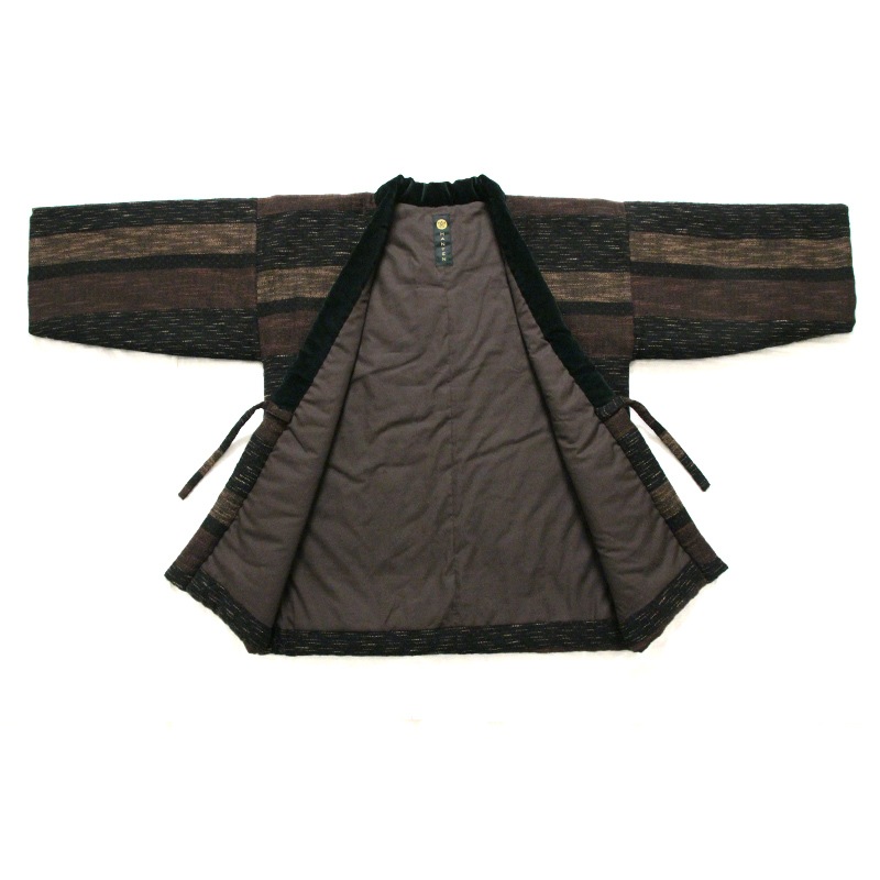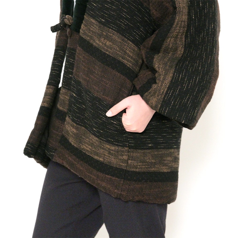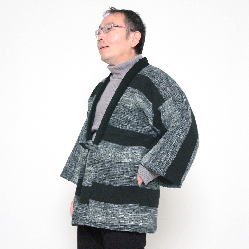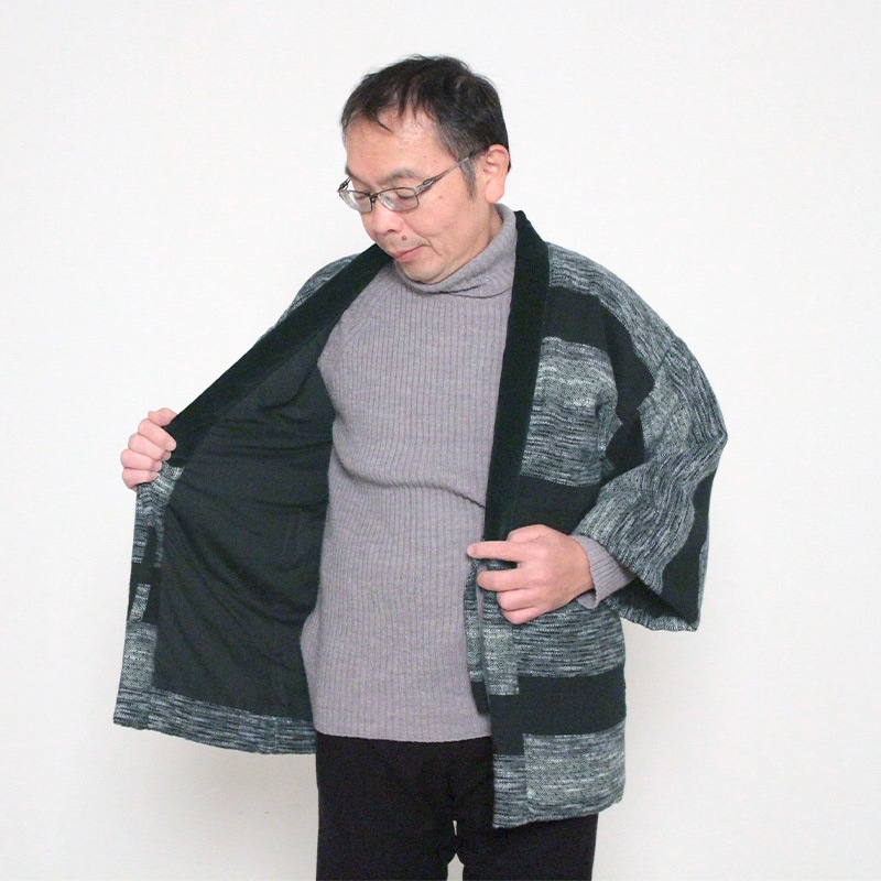 風通織りの立体感と色の重なりが生み出す、表情豊かなはんてんができました。風通織りならではの奥行きを丁寧に引き出し、上品な雰囲気をまとったデザインに仕立てています。黒別珍衿仕立て。日本製。