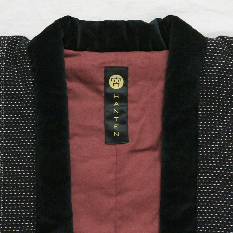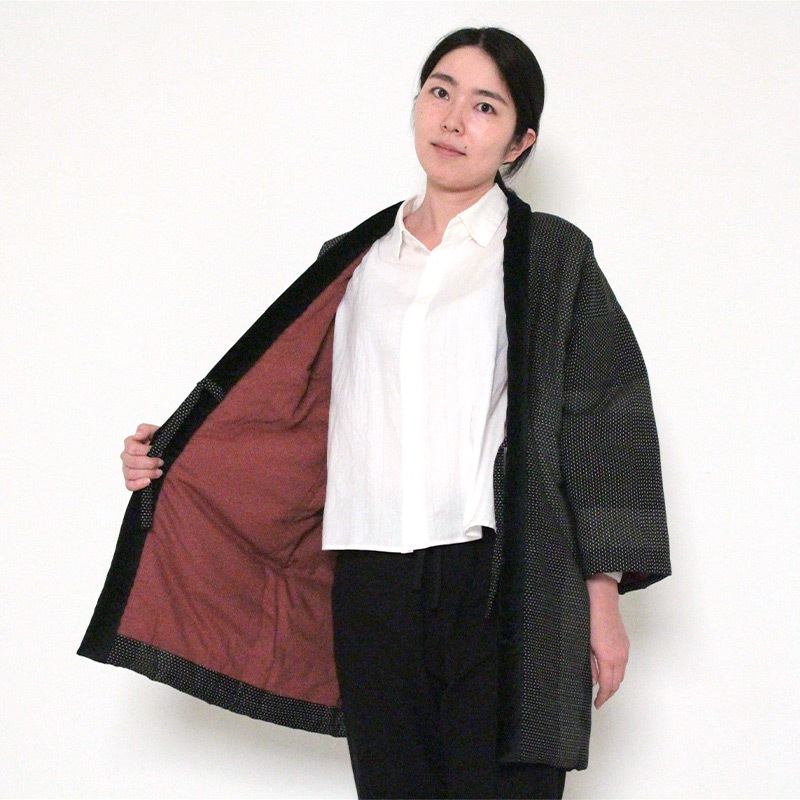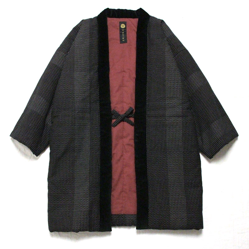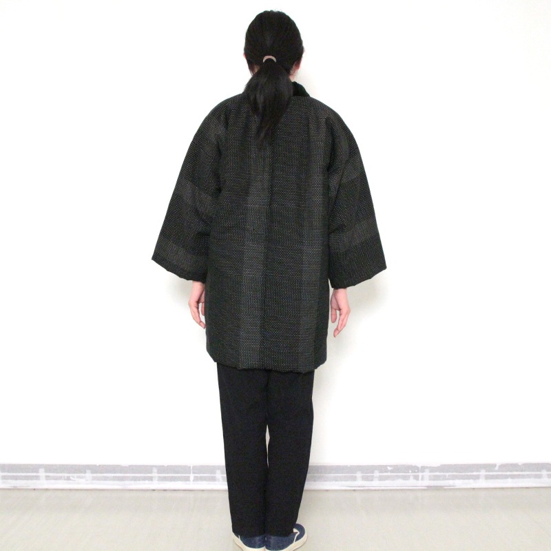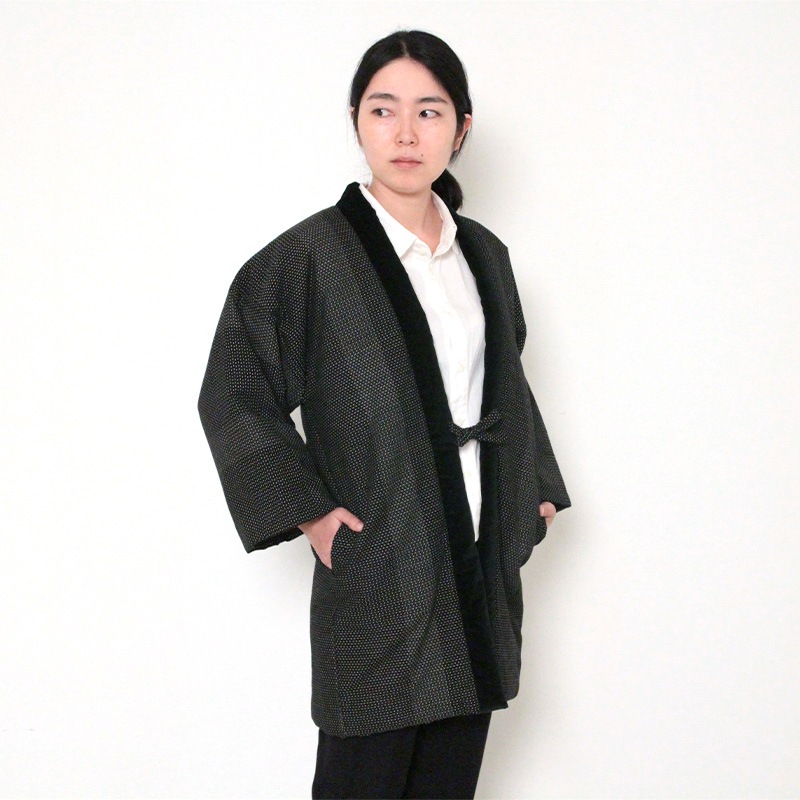 繊細な織りの表情がさりげなく映える、上品な雰囲気のはんてんができました。凹凸のある織り柄が単調にならず、落ち着いた中にも奥行きを感じさせます。黒別珍衿仕立て。日本製。