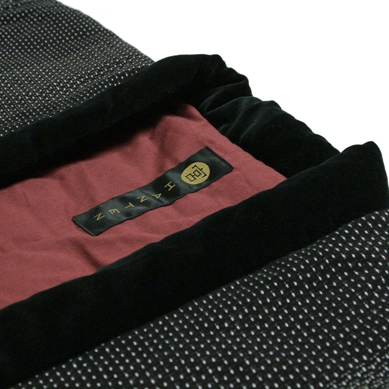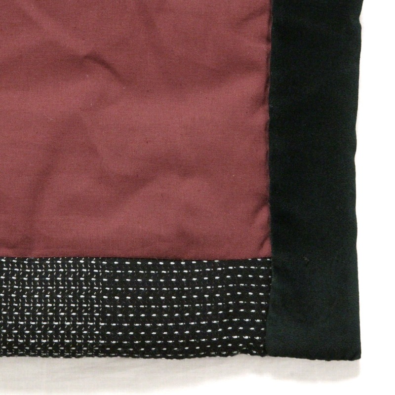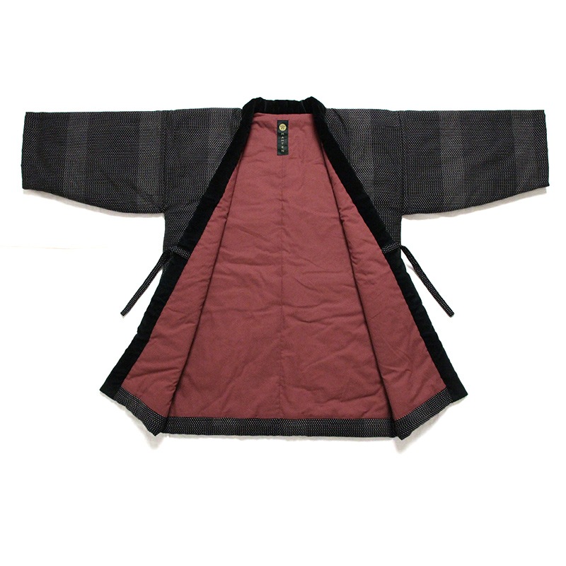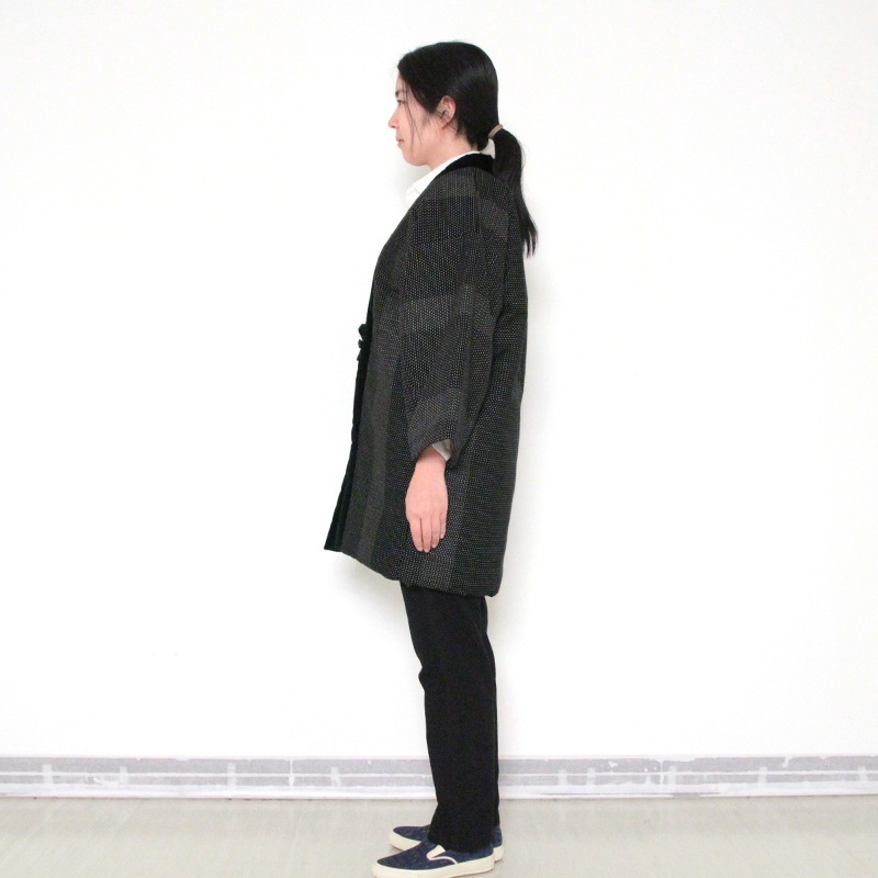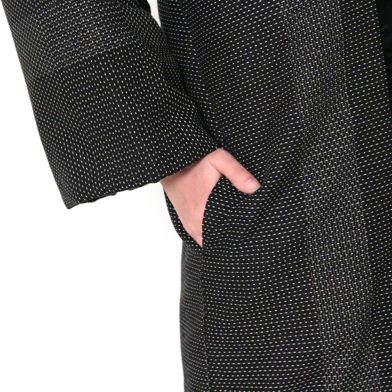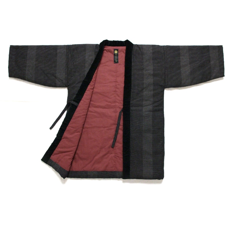 繊細な織りの表情がさりげなく映える、上品な雰囲気のはんてんができました。凹凸のある織り柄が単調にならず、落ち着いた中にも奥行きを感じさせます。黒別珍衿仕立て。日本製。