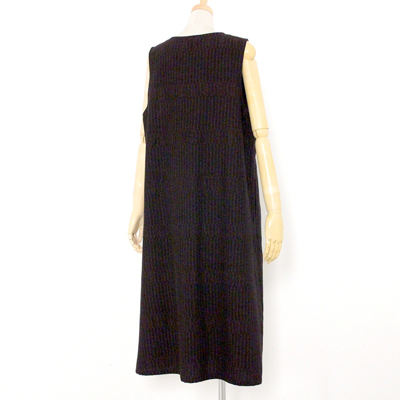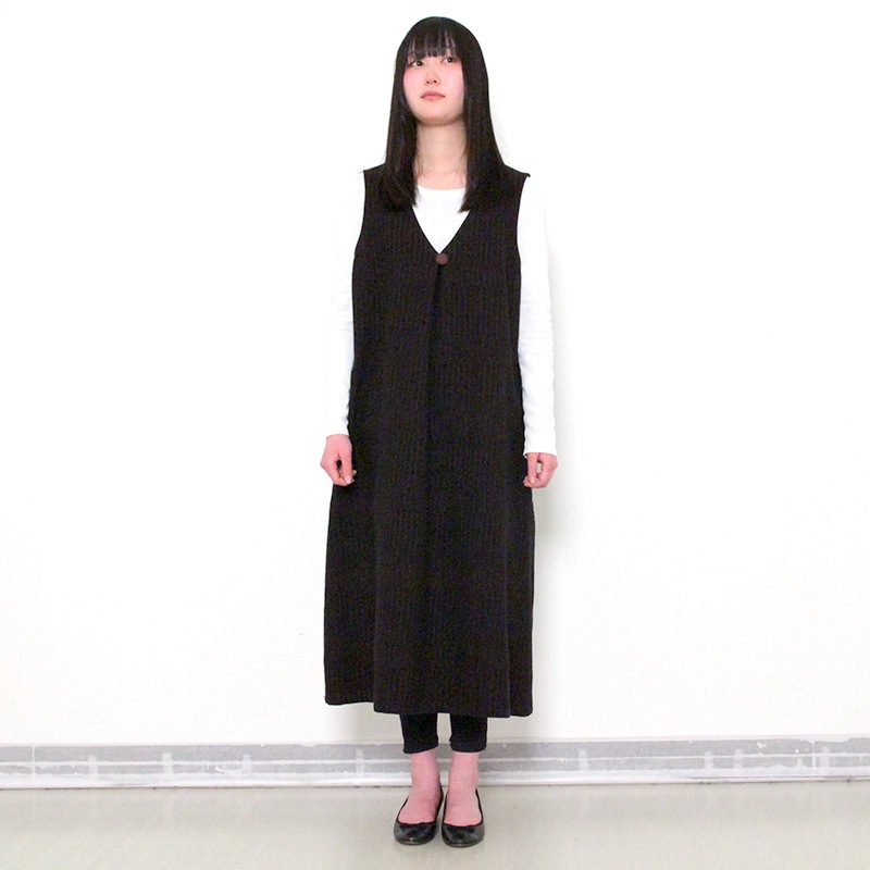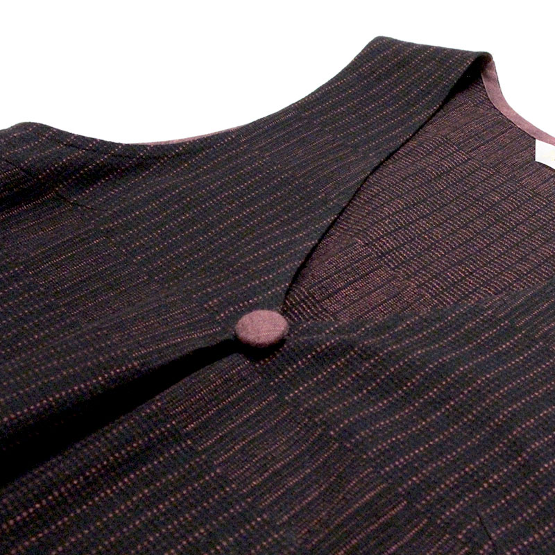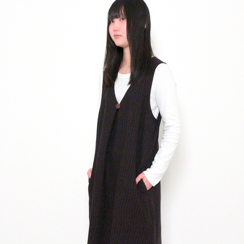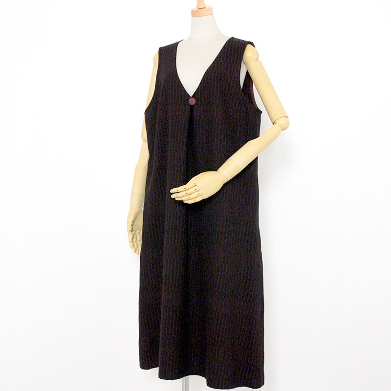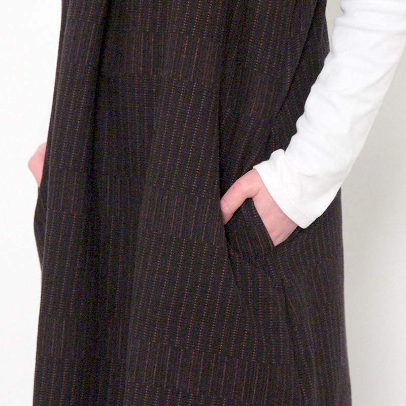 ゆったりとした着心地のかぶり式ジャンパースカートです。 和木綿「光珠(こうじゅ)」の季節感ある落ち着いた表情の生地を使用し、秋冬にも心地よくお使いいただけます。 体型を選ばないシルエットに、胸元のくるみ釦が上品さを添える、実用的で落ち着いたデザインです。日本製