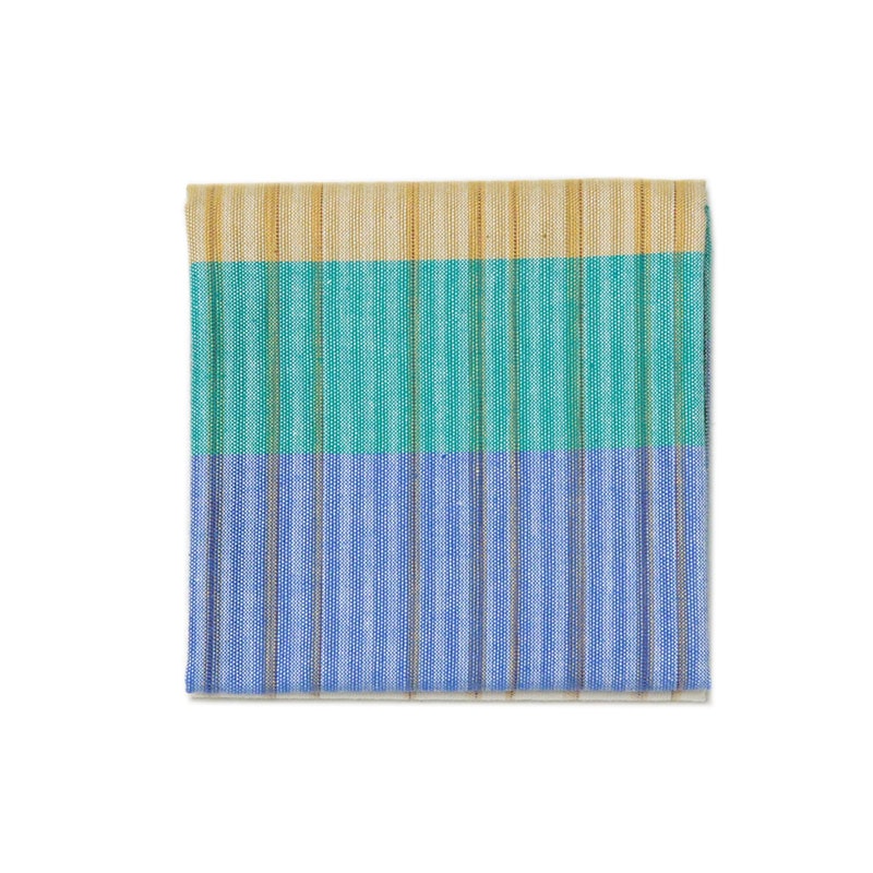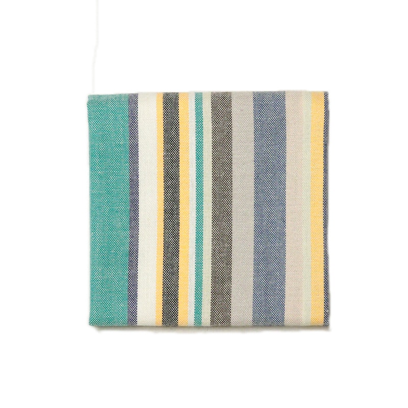 ブルーやグリーンを基調とした太めの縞に、ベージュ系の細い縞が縦横に重なり合う柄。 |
